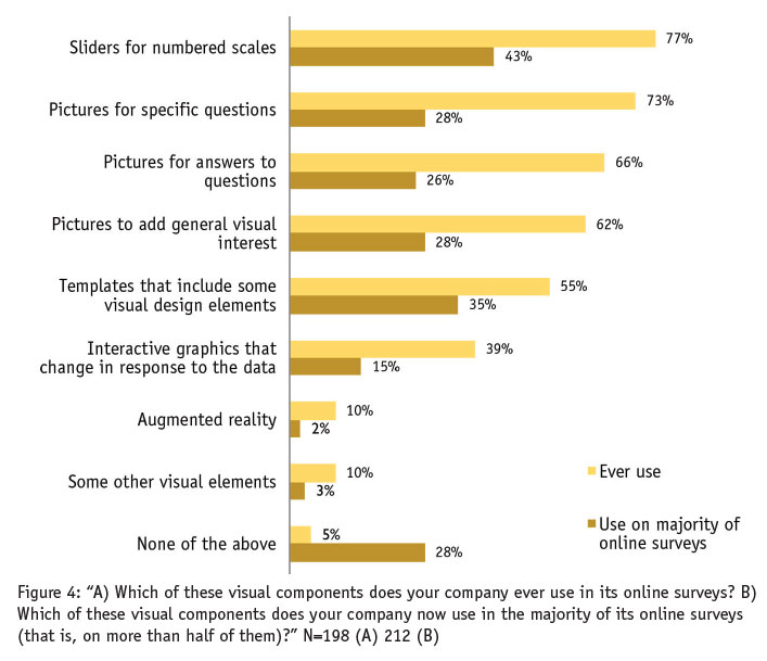 In one question (not shown here) it turns out 90 percent of companies say it’s important to make online surveys more visual in appearance. We asked them what kind of visual components they use in surveys (Figure 4). We are heartened to see that many have tried interactive graphics and a few have also used augmented reality, which is truly innovative.