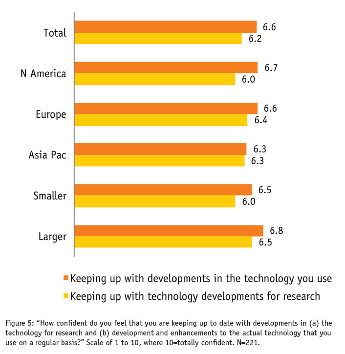 We find research companies are not very confident in keeping up to date with technological development in the software they use and even less so with industry advances, as is apparent from the low scores in Figure 5. While North American firms are the least confident in staying abreast of industry-wide developments, they are slightly more confident than others on knowing how the technology they are using is developing.