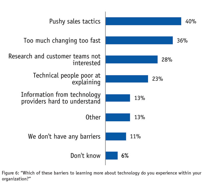 Concerns about the rate at which technology continues changing come high among the barriers research companies identify in learning more about what technology can offer. None of us can control the rate of change but anxieties will be magnified if you don’t manage to put in all the time you intended to find out what’s happening, as many firms admitted. Despite this, what tops the list is something that technology providers can address – and they need to. Research firms singled out pushy sales tactics as the No. 1 obstacle (Figure 6). In verbatim comments, companies said they wanted to see more evidence to back claims, more real-life case studies and less “snake oil.”