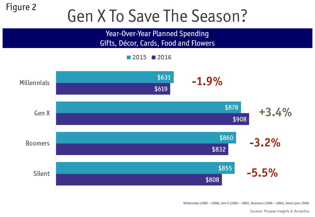 Key takeaway: Retailers should be zeroing in on Gen X-ers, who are in their prime earning years and intend to spend more this year than last. This oft-overlooked generation is accounting for the largest proportion of planned gift spending; Gen X shoppers are budgeting $46.6 billion on holiday gifts this year, 60 percent more than their Millennial counterparts (Figure 2).
