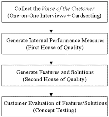 We settled on a multi-step approach to move Global Diagnostics from the formative stages to concrete new product concepts (see flow chart). The first step would be to gain a thorough understanding of customer wants and needs (i.e. the voice of the customer via the VOCALYST process). The second would be to use quality function deployment (the “house of quality”) to translate those wants and needs into internal performance measures (or metrics) and ultimately into potential features or solutions that tie directly back to the voice of the customer (VOC). The last step would be to go back to customers and test the top features and solutions to determine which concepts were most attractive to them.