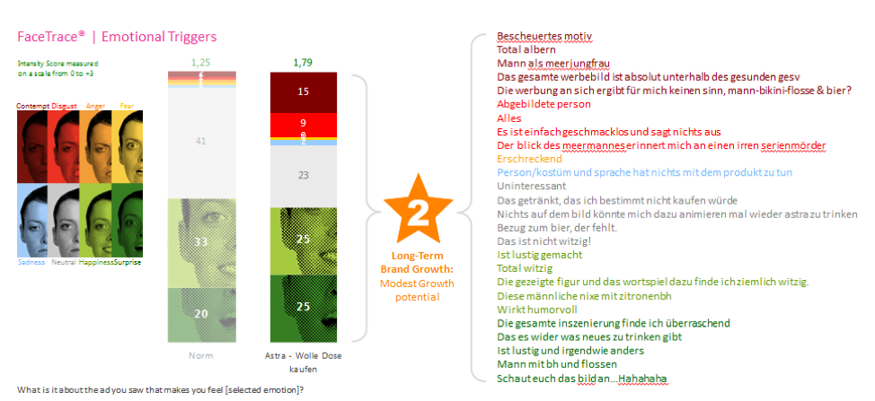 The topline score tells us that while the ad may have been polarizing, it wasn’t necessarily good. Astra’s "Wolle dose kaufen?" scores two stars, suggesting there’s room for only modest long-term brand growth. It’s a deeply average score. For an ad creating waves in the headlines, it offers little more than a ripple when presented to the general public.