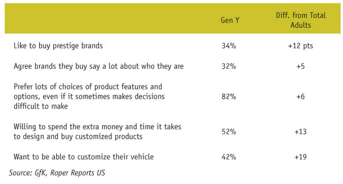 Of course, customization is also big deal for Gen Y; they grew up at a time when it could actually be expected in many circumstances – and customizing makes any product “all about me.” (You might say that every Gen Yer is his or her own favorite brand.)