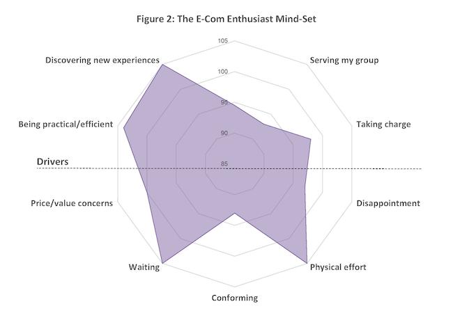 We’ll begin with the 20% who are E-Com Enthusiasts when shopping for food and beverage (Figure 2). These shoppers are driven to explore and discover new things, as they are constantly seeking novel life experiences and better ways of doing things. On the barriers side, they don’t want to put in too much effort to get what they need and they don’t like waiting. But this is not merely convenience or speed; they’re pursuing new discoveries and e-com lets them explore efficiently, in ways that fit their everyday lives.