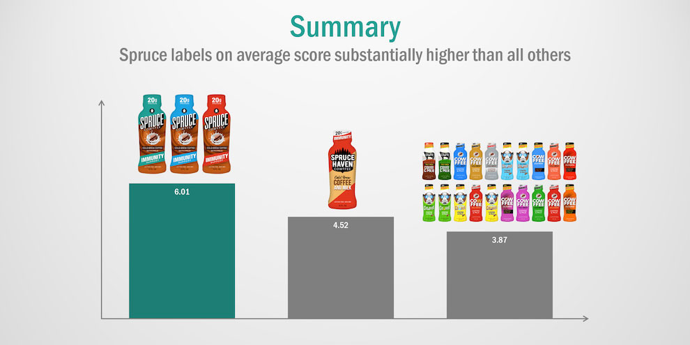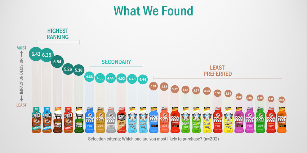 Spruce was ranked almost twice as high as the Cowffee alternatives, with Spruce Haven somewhere in between (Figure 6). As an aside, we did find that the larger the font for the name Cowffee, the poorer the package performed – which is not something we would have predicted. Clearly, this target group of Gen Z and Millennials have their preferences for what this product should have been called, proving the importance of conducting research and illustrating the importance of eliminating personal bias in steering the business in the right direction for success.