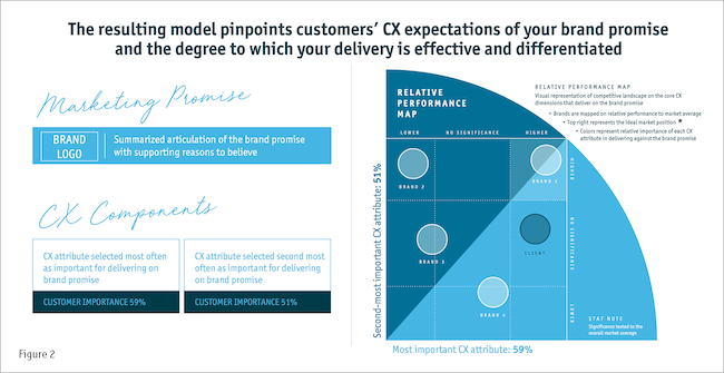 As such, we added just one module to our competitive experience tracker. We started with the brand promise and then carefully constructed experiential attributes that covered the touchpoint landscape and spoke to the brand promise. We then surfaced the promise to respondents and asked which of the attributes were most important to deliver and, finally, how each competitor performed on each of the experiential attributes. This allowed us to create a marketing and CX relative performance map, as shown in Figure 2.