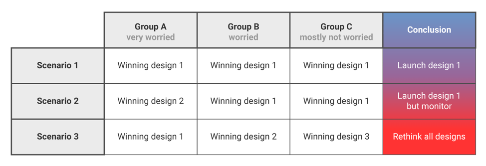 In Scenario 2, the winning design is Design 1 for group B and C, but Design 2 for group A. If we presume groups B or C are our future consumers, Design 1 is still a good choice. Here, it might be interesting to check the insights from group A and see whether the data sparks some new ideas or space for improvement.