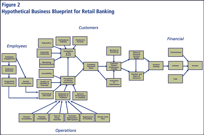 A hypothetical blueprint for retail banking is illustrated in Figure 2. For this particular bank, it would provide the basis for identifying the operational, employee, customer and financial variables for which data should be captured. In addition, the blueprint suggests how these variables are related, which furnishes a basis and direction for how the data should be integrated and analyzed.
