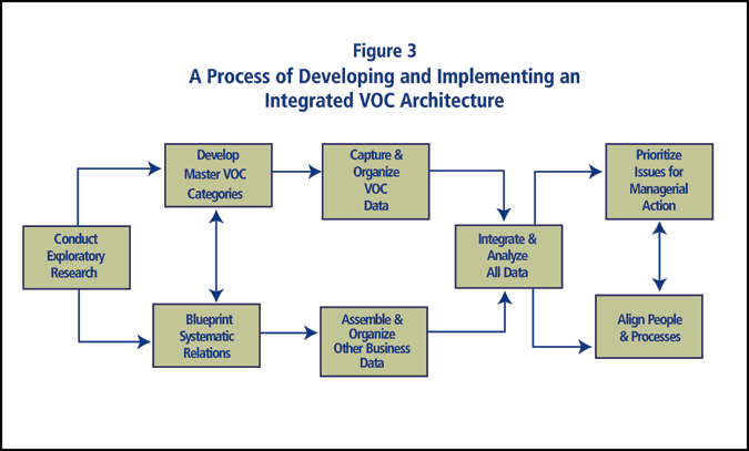 An organization cannot be truly customer-driven in the absence of an integrated VOC architecture. Gathering and analyzing data on customer experiences and relationships is a necessary, but not sufficient condition to ensure implementation of such an architecture. In addition, an organization must integrate all VOC data using a common set of categories representing all key aspects of the total customer experience and establish the relevance of VOC data to other key business process and performance metrics.