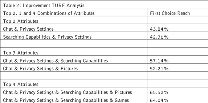 Consistent with the overall results, privacy settings and searching capabilities are commonly identified in each analysis. In contrast, some attributes rise to the top that had relatively low rankings and improvement scores in the overall analysis. For example, chat is ranked fourth in overall results, but is prioritized substantially higher in TURF analysis. Pictures (tenth) and games (twelfth) and are ranked relatively low in the overall results, but are prioritized substantially higher in TURF analysis when three- and four-attribute combinations are examined. This demonstrates the usefulness of TURF analysis for prioritizing improvement efforts.