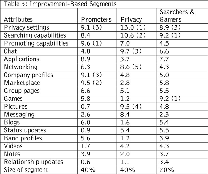 Clearly, the Promoters segment has a focus on improving Facebook’s commerce-related activities. This segment places the highest preference on improving the promoting capabilities (9.6) of Facebook, followed closely by improving the marketplace (9.5). Both of these improvements are commerce-related. The next highest preferences for improvement include company profiles (i.e., also commerce related) and privacy settings.