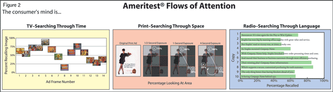 As a diagnostic construct, the Flow of Attention deals with the sorting and scanning functions of the right-brain, the perceptual basis of how we perceive the world visually. With a TV commercial, it measures how selective attention varies over time, as the viewer sorts through the series of the images from the beginning to the end of the film; with a print ad, it measures how attention varies over space, as a reader scans the layout of the ad. (See Figure 2 for an example of the difference.)