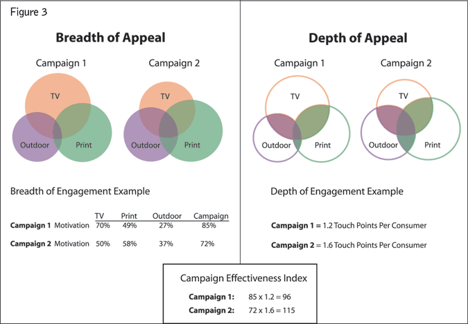 A key question to ask when testing creative elements across media platforms is whether the different pieces of creative are motivating to the same consumer segments. In this example, if we were to ask the question, “How many consumers were motivated by at least one execution in the campaign?”, this is the intersection of the sets of consumers motivated by different elements in the campaign. We see that Campaign 1 has more “breadth” of appeal, 85 percent to 72 percent. What if, on the other hand, we were to ask the question, “On average, how many different executions impact a given target consumer in a motivating way?” This is the intersection of the sets of consumers motivated by different elements of the campaign. Now we see that Campaign 2 wins, with an average of 1.6 versus 1.2, of what we call “motivational touchpoints” or motivating ads per consumer. So we can say that Campaign 2 has greater “depth” of appeal.