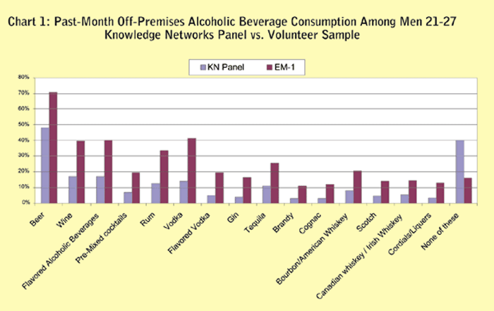 In the alcohol research, we first examined the data to see whether or not the different vendors produced comparable levels of on- and off-premise alcohol consumption among men ages 21 to 27. Second, we evaluated whether the data exhibited the same relative distributions across the vendors. Finally, we investigated the extent to which weighting the volunteer samples changed the results of the first two analyses. In all cases, we found that the data from the volunteer groups differed significantly from the KN data.