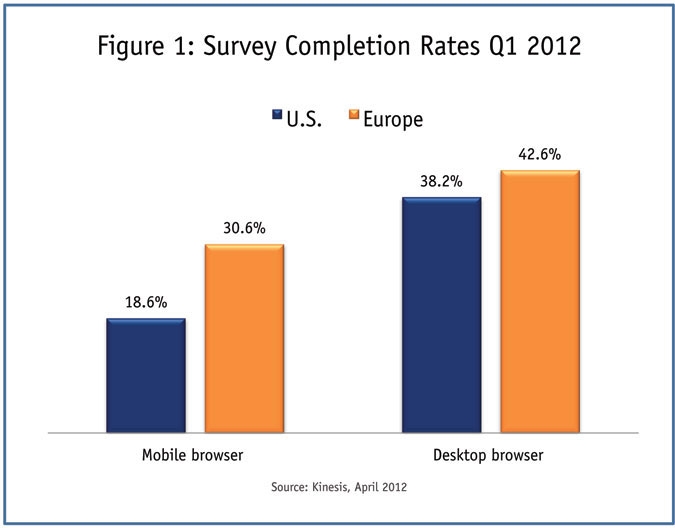 Figure 1 provides Kinesis’ survey completion rate statistics from Q1 2012. It differentiates completion rates based upon the type of browser used (in this instance, tablet devices are included with mobile browsers). In the U.S., 18.6 percent of those using mobile browsers on the Kinesis platform are completing the online survey that they enter, versus 38.2 percent for desktop browsers. These statistics are irrespective of whether the survey they entered was programmed to support mobile browsers or not, as well as irrespective of survey length and methodology. The data are reflective of mobile respondents across all surveys, regardless of type (desktop only, mobile only or dual mode). This statistic makes sense, since mobile respondents are more likely to terminate from a standard-length online survey, which represents the majority of online survey traffic.
