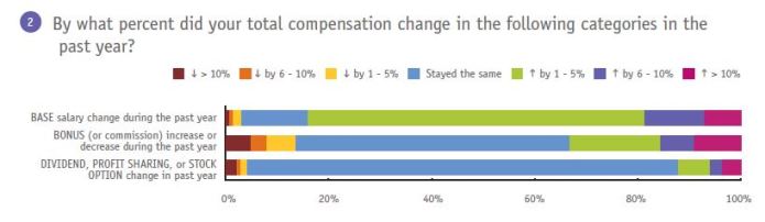 And when it came to bonus or commission increases, although 53 percent of respondents reported no change in the last year, we received a number of comments from respondents who are finally obtaining the rewards of years of hard work: