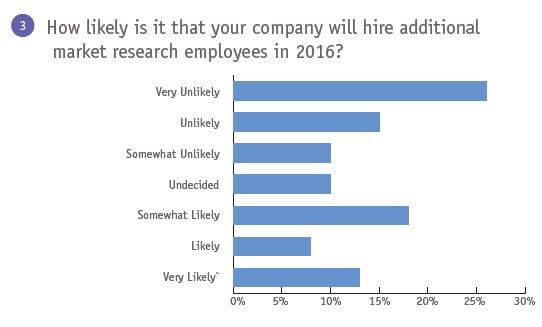 This year, approximately 39 percent of respondents said it was somewhat likely, likely or very likely that their company would hire additional MR employees. When looking at the result of crossing the question, “How likely is it that your company will hire additional market research employees in 2016” with, “How satisfied are you with your current employment,” we saw a positive correlation. In fact, 82 percent of those who reported that their company was somewhat likely, likely or very likely to hire in 2016 were somewhat satisfied, satisfied and very satisfied with their employment. This compares to a 68 percent reported satisfaction if their company was somewhat unlikely, unlikely or very unlikely to hire additional marketing researchers. 3