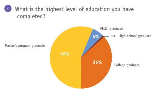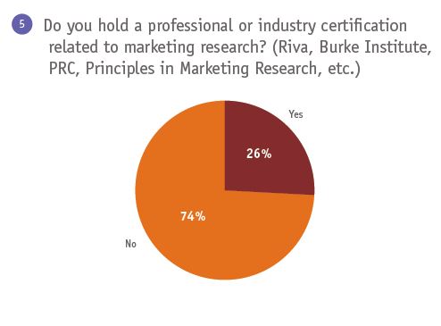 Researchers can bring a wealth of experience with them when changing companies. Approximately 30 percent of respondents reported 16 to 25 years of experience in marketing research. Master’s degrees are also common, as 56 percent of respondents shared that they are graduates of a master’s program (6 percent reported having a Ph.D.). When asked if they held a marketing research certification (RIVA, Burke Institute, Principles in Marketing Research, etc.), 26 percent of respondents said yes. 4 5