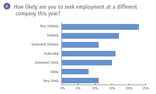When looking at the result of crossing the question, “How satisfied are you with your current employment” and, “How likely are you to seek employment at a different company this year” we were a bit surprised to find that 73 percent of respondents that reported being somewhat satisfied, satisfied or very satisfied said they were somewhat likely, likely or very likely to seek employment elsewhere. Maybe it is a case of the grass always being greener on the other side. 6