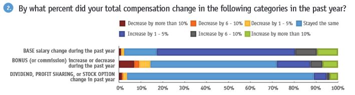 For corporate researchers who are satisfied, the recent steady increase in total compensation may be one reason for finding job satisfaction. Less than 3 percent of respondents reported a decrease in base salary during the past year and more than 82 percent saw an increase. Of the 82 percent, approximately 63 percent received a base salary increase of 1-4 percent, which is generally enough to stay ahead of inflation.