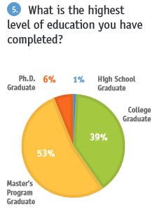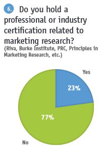If researchers are looking for new opportunities, they can bring a wealth of experience with them. Approximately 59 percent of respondents reported 11 or more years of experience in marketing research (with 14 percent reporting 25+ years of experience). Master’s degrees are also the order of the day: 53 percent of respondents shared that they are graduates of a master’s program (6 percent reported having a Ph.D.). When asked if they held a marketing research certification (RIVA, Burke Institute, PRC, etc.), 22 percent of respondents said yes.