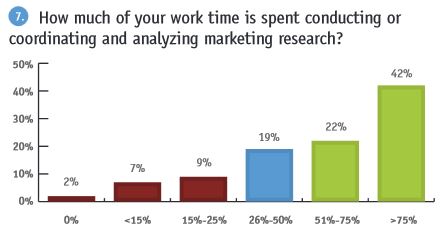 Each year we ask corporate researchers how much work time is spent conducting, coordinating and analyzing marketing research. This year approximately 42 percent of respondents reported spending 75 percent or more of their time dedicated to MR. It is good to see that researchers are able to focus on the research during a time when many claim that the changing economy, big data, new technology and social media have disrupted the industry. Research analysts cited the highest average time spent conducting or coordinating and analyzing MR, followed by senior research analysts, market research managers and customer insights managers.