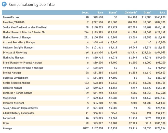 Note: The market research salary and compensation survey was conducted online from May 12 to June 9, 2015 among Quirk’s subscribers. In total we received 3,043 responses. We received 1,057 usable surveys from client-side researchers (corporate market research) and 1,496 usable surveys from provider-side researchers (market research company employees). An interval (margin of error) of 1.7 at the 95 percent confidence level was achieved. (Not all respondents answered all questions.) For complete survey results with crosstabs visit: http://www.quirks.com/jobs/research-salaries/Market-research-salary-by-title.aspx.
