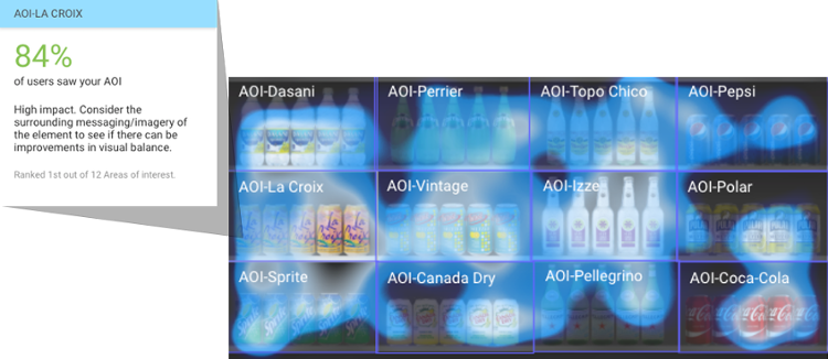 Using a randomized shelf tool, we created a study comparing La Croix to 11 beverage competitors. One hundred general population, opt-in participants were sent the study on their computers and their eye-tracking sessions were recorded via their Webcams. Each participant was exposed to the randomized shelf of 12 sparkling water and soda brands for 10 seconds, once with no direction and once directed to find La Croix. After fielding for an hour, the results were in and we were pleasantly surprised with what we found!