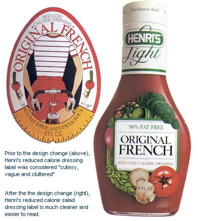 The new label is much cleaner and easier to read with the name of the flavor printed boldly in the center. Above it, "90% Fat Free" is dominantly displayed; highlighted below is "Reduced Calorie Dressing." The words are surrounded by a variety of fresh vegetables. The neck of the bottle sports a simplified yet more prominent “Henri’s" and right below that is a bold "Light" signature that instantly communicates to consumers, "reduced calorie."While packaging research was taking place, product research was also being conducted to assure consumers preferred Henri's taste over competitive dressings, says Hansen. The Light dressings were introduced in late 1986 and by late 1987, Henri's had converted its regular calorie salad dressing line to a modified version of the Light label design.