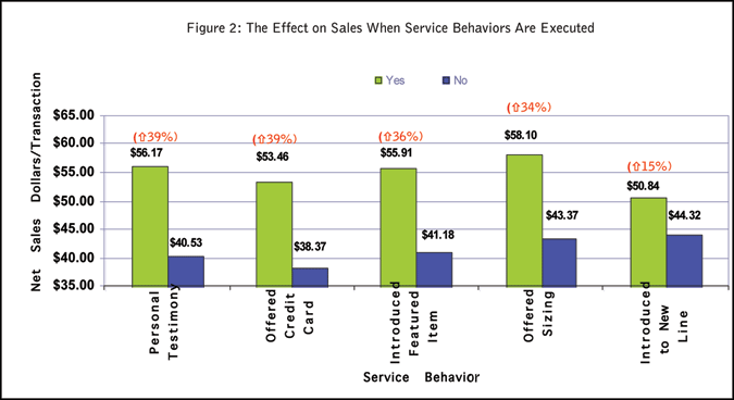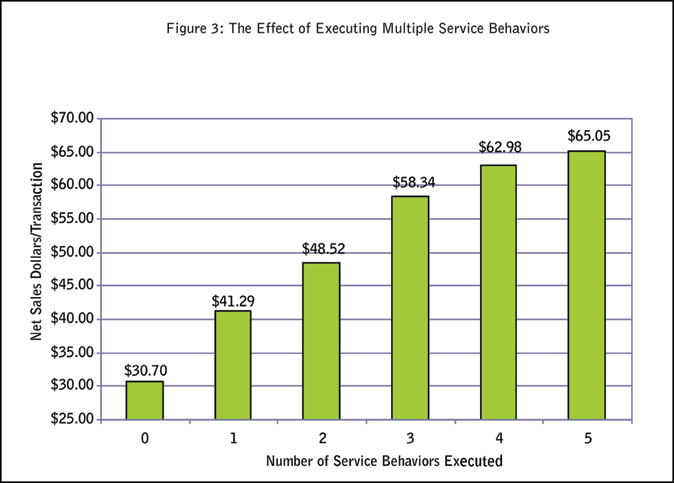 There’s an even more powerful effect for this retailer, however, when they begin to combine the individual behaviors in the model to create an entire service experience. You can see in Figure 3 that the transaction value more than doubles, on average, between customers who do not experience any part of the service model and those who experience all five service behaviors. Clearly, it is critical for this retailer to make sure that every associate understands the service model and is able to execute all behaviors associated with it.
