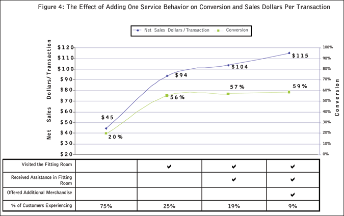 We have seen that proper execution of service behaviors can positively impact sales immediately through increased retail purchases. However, executing more service behaviors may not always be better for the bottom line. Instead, the right behaviors at the right time may have a bigger impact. To illustrate, we need to look not only at incremental sales but also at customer conversion rates. Most retailers do not have the luxury of staffing budgets that would allow for 30-minute interactions with every customer who walks in the door. In addition to training associates to execute service behaviors, it is also important to teach them how to break away appropriately so that all customers receive assistance.