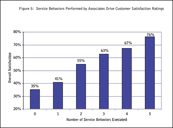 These examples illustrate that there is an immediate payoff if companies can get their associates to create the kind of service experience they want. However, does the increased transaction value come at the cost of customer satisfaction and future purchases? Not necessarily. When we examine the link between service behaviors and customer satisfaction, we again find that the more service behaviors exhibited, the more likely customers are to be “highly satisfied” with their overall experience (see Figure 5).