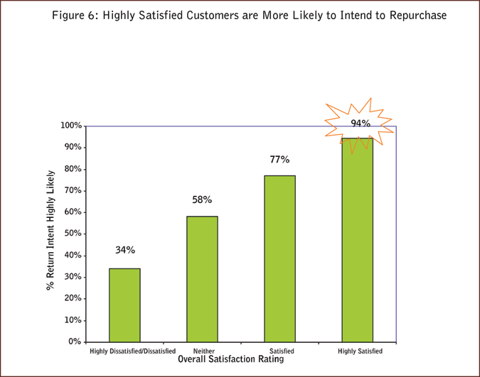 According to The Service Profit Chain (Heskett, Sasser and Schlesinger, 1997), the more satisfied customers are, the more likely they are to be converted into loyal customers. Customer loyalty is operationalized on many satisfaction surveys as the customer’s intention to return (repurchase) and the customer’s intention to recommend (positive word-of-mouth). A consistent finding across all of the retailers we study is that customers who rate their overall satisfaction in the top box (highly satisfied) are much more likely to intend to return to a particular retail outlet or recommend that outlet to friends and family. A typical loyalty curve plots satisfaction scores against customers’ loyalty intentions (see Figure 6). In this example, highly-satisfied customers are almost 25 percent more likely to indicate they are highly likely to return than merely satisfied customers and over 175 percent more likely than dissatisfied and highly-dissatisfied customers.