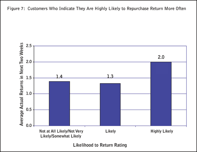 Because the difference between merely satisfied and highly satisfied customers impacts their loyalty intentions so strongly, service behaviors that can motivate customers to indicate they are highly satisfied will pay dividends in customer loyalty. But do intentions to return actually predict a customer’s true likelihood to return? Again, transactional data can be used to find the answer. When aggregating intent to return to the unit level and examining the relationship with comp-sales, we have to contend with a lot of noise in our model. Differences in store-level characteristics like convenience of location, competition and store volume may affect the relationship between the average intentions of all customers to return and actual comp-sales numbers. Fortunately, transactional data allows us to examine a customer’s intent to return in relation to whether he or she actually returned.