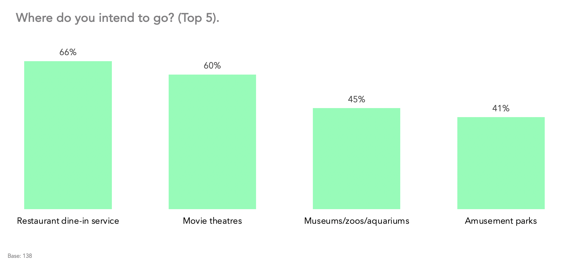 What used to be so normal was missed by so many of us once indoor dining was shut down. So 66% plan to start venturing out by dining in again, and 60% will go to the movies. After all, who doesn’t love salty, buttery popcorn – and entertainment? Many counties can do these now, but not all.3