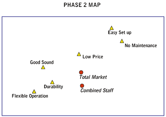 Step 6. The research results are presented to the task force. The Phase 1 map demonstrates to the sales staff that, indeed, they are correct in feeling that a substantial number of consumers demand easy set-up, no maintenance, and low price. The map also shows that, indeed, the technical staff is correct in feeling that a substantial number of consumers want durability, good sound and flexible operations.