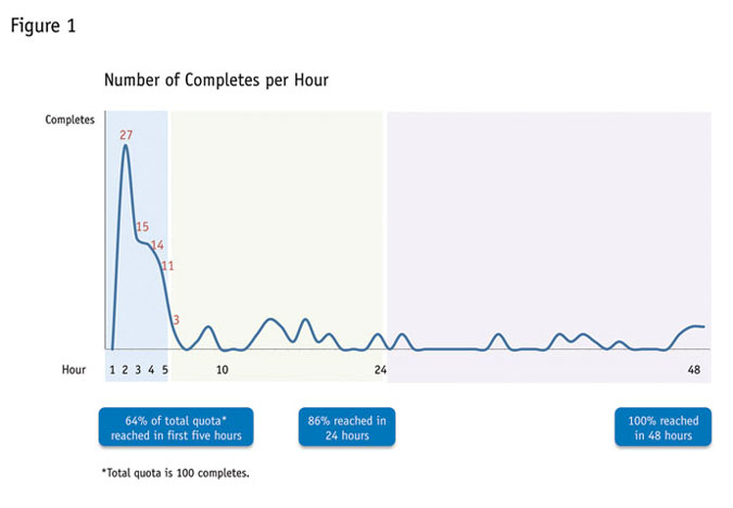While we had expected to be in field for seven-to-10 days, the quota was filled within two days, with 64 percent filled within the first five hours of launch (Figure 1). Keeping in mind that this was a task- or activity-based exercise, the results exceeded expectations.