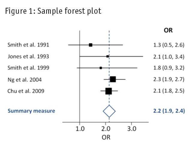 Figure 1 shows a simple example, taken from Wikipedia, based on five studies. In practice, sometimes dozens or even hundreds of primary studies are used. In the plot, the size of a square is proportional to the corresponding study's weight in the meta-analysis and the horizontal line represents the confidence interval of the study's odds ratio (OR), an effect measure that is standard output from logistic regression and equals 1.0 when there is no effect. The diamond at the bottom of the plot reports an overall odds ratio of 2.2, with the real effect size estimated to lie between 1.9 and 2.4.