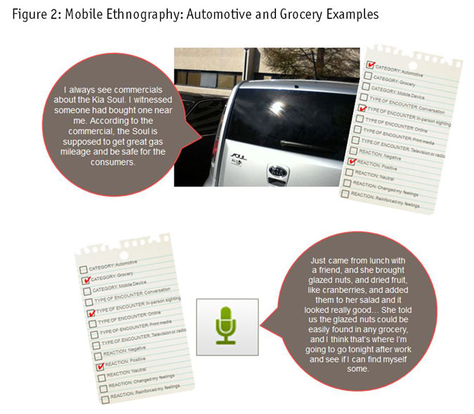 We also engaged community members in a mobile ethnography activity, which enabled them to capture and share their pre-shopping moments with us as they occurred. Members downloaded a smartphone app for this special project but we did not ask them to show us how they shopped. Rather, we asked them to document every time they saw or experienced something that might influence - positively or negatively - how they thought about grocery products, automobiles or mobile devices.