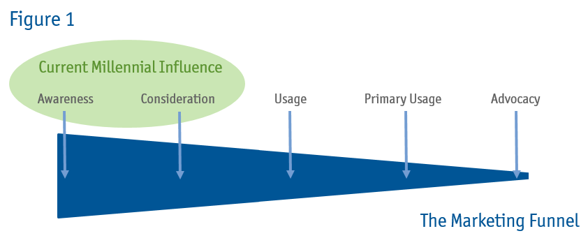 So, what does this mean for B2B marketers and researchers? Since nearly half of B2B purchasing research is conducted by Millennials, B2B marketers should optimize their channel strategy to the needs of this generation. The focus should predominantly be at the early stages of the marketing funnel – generating awareness and consideration – which is where Millennials are most involved now (Figure 1).