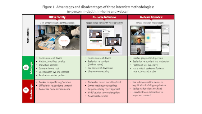 Webcam interviews are a popular alternative, where you conduct a virtual interview through a platform using a webcam. With device testing, you need to use virtual stimuli (e.g., images, animation, videos) or ship devices to respondents. This approach has the potential advantages of having a wider geographic dispersion of respondents, as well as being able to field more quickly and be lower in costs due to no travel. The approach is easier for respondents, moderators and clients because there is no travel required. Most virtual platforms have a virtual backroom, allowing client interactions and moderator probes. However, clients may be less engaged compared to attending in person research.