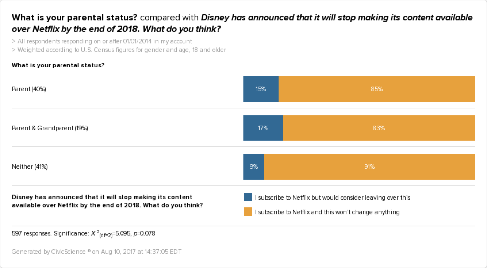 The earliest figures suggest that 15 percent of Netflix subscribers would consider leaving Netflix in response to Disney’s recent announcement that it will remove all content from the platform. The groups most likely to be affected include women, parents and grandparents.
