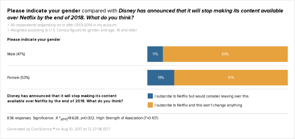 Two demographics seemed to jump out during our initial analysis. First, we found that women are much more likely to leave Netflix without Disney and second, that parents are more likely to, as well.