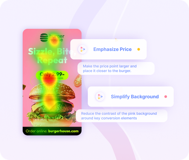 Figure 1: Ad with AI heatmap. Predictive AI shows attention patterns, while suggestive AI explains how to improve impact.