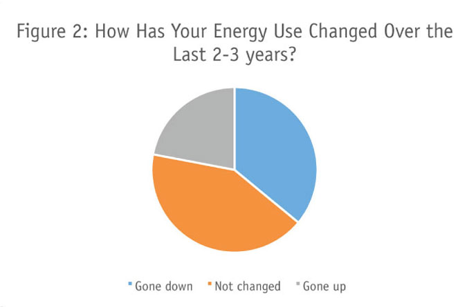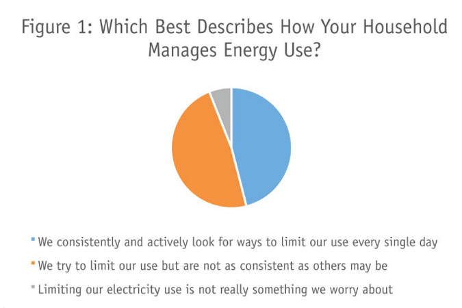 But how do these attitudes translate into behavior? In Figures 1 and 2, we see that nearly half of these customers say they “consistently and actively” look to reduce their energy use every day, while almost no one says that limiting energy use is not really something they worry about. As a consequence, most customers report that their energy use has either gone down – or at least not changed – over the course of the last two-to-three years.