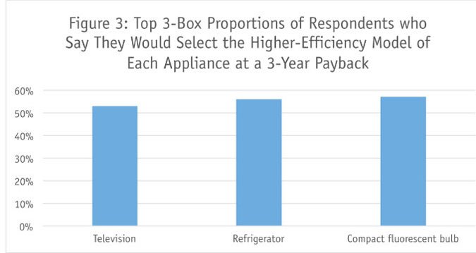 As Figure 3 suggests, the findings are quite similar across different electric end uses. In each case, whether for major appliances or compact fluorescent bulbs, just over half of respondents say they would purchase the more efficient option if the payback was more than three years.