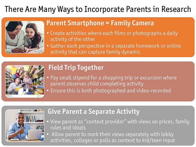 - When doing in-home interviews, I ask parents to join us after our discussions with children and teens to hear from their child about what we covered and ask their opinion about some purchase behavior so I have a full context of what happens in their home. I also allow attending clients to ask productive questions of parents about their purchase decision process if they’d like.