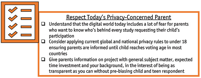 For many years now, I have used an important two-part recruiting process that encourages interviewing parents first, then children. This ensures that children under 18 are articulate, savvy consumers of your client’s product or service. It also is an opportunity to bring parents into the process beyond just getting their permission for their kids to participate. Most often I make parents a part of both my in-person and online work to create a feeling of transparency and cooperation. The result of this collaboration produces a feeling of safety in our data-weary world to encourage a more productive kid and teen respondent – especially more recently with Generation Z.