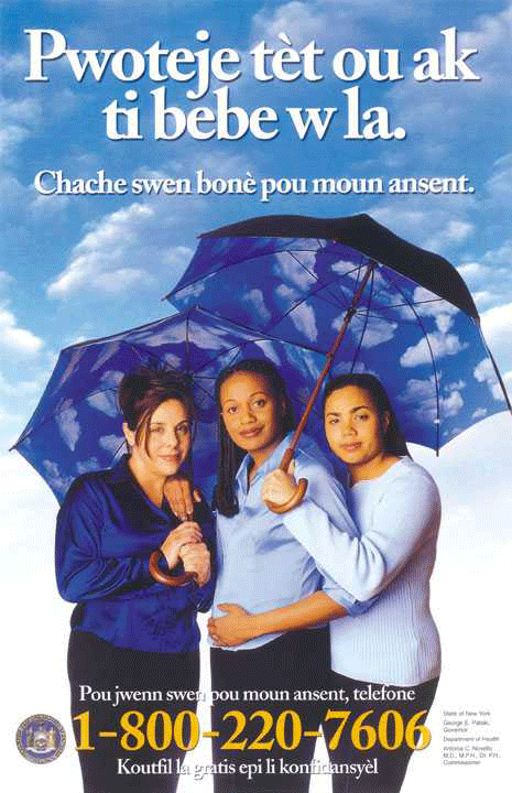 The Haitians selected the message, “Protect yourself and your baby. Get prenatal care,” in Haitian-Creole, along with the picture of the three women with umbrellas. Initially, the image of the three hands led, but in the trade-off, the three women with umbrellas prevailed. The umbrella was viewed as a protector of fragile pregnant women.