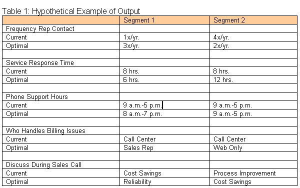 Conjoint analysis provided optimal levels of service to meet customer needs across many key touchpoints, and these were compared with perceived current levels of service in these areas. Table 1 shows a hypothetical example for two customer segments.